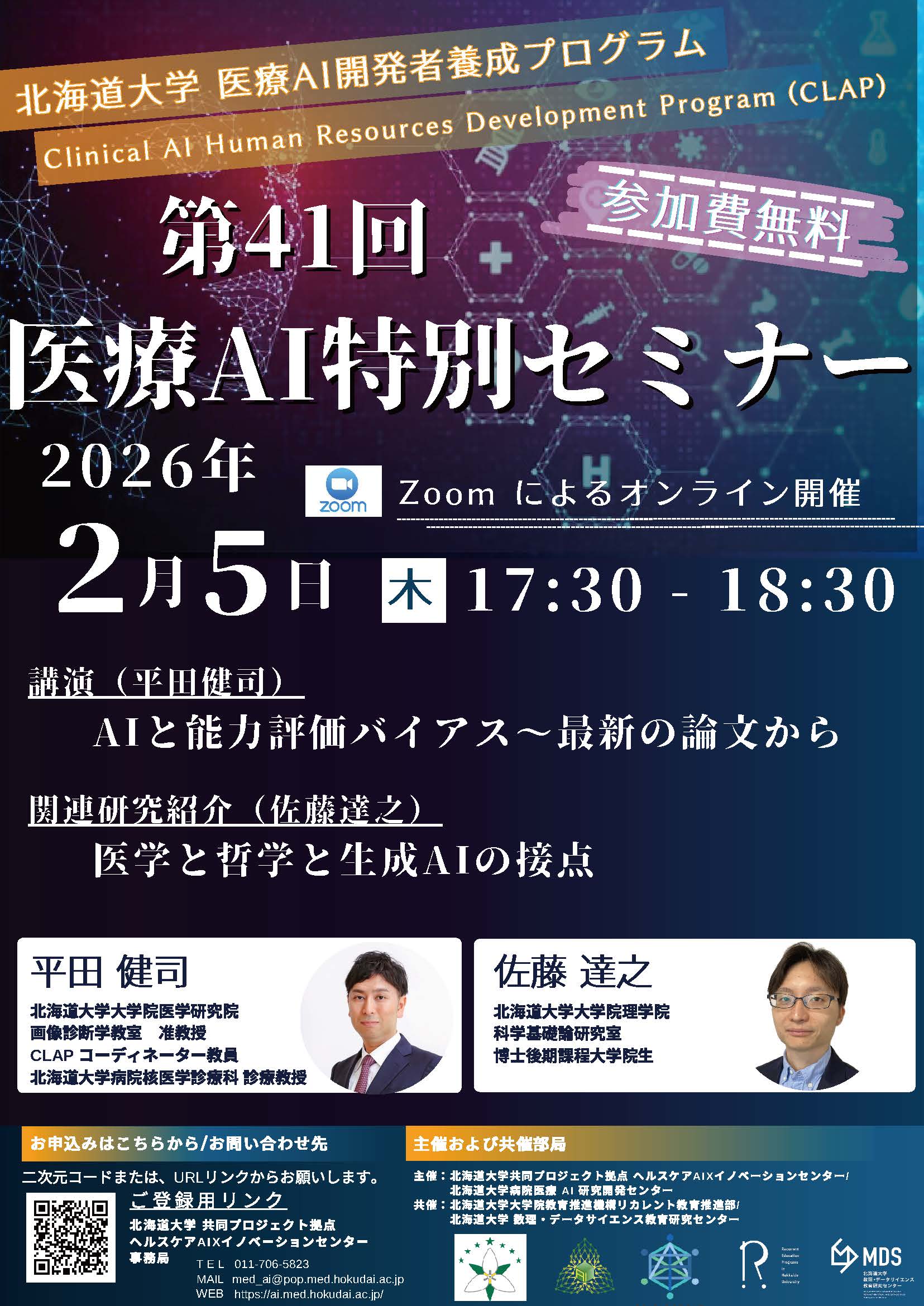 詳細なプログラム内容につきましては、ポスターまたは北海道大学ヘルスケアAIXイノベーションセンターウェブサイトをご参照ください。