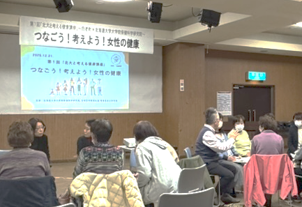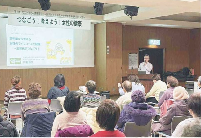 2025年12月21日に「第1回北大と考える健康講座」が白老町にて開催されました。月経・妊娠・更年期など女性のライフコースに沿って変化する心身と健康づくりに関する内容となっており、約35名の白老町民にご参加いただきました。