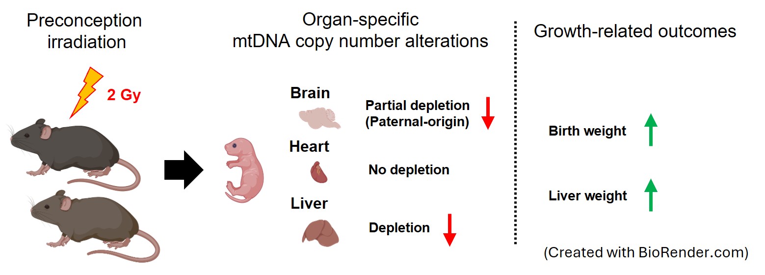 妊娠前の放射線被ばくは、子どもの臓器ごとにミトコンドリアDNA量を変化させ、出生時の体重や肝重量の増加と関連していたことを示す。