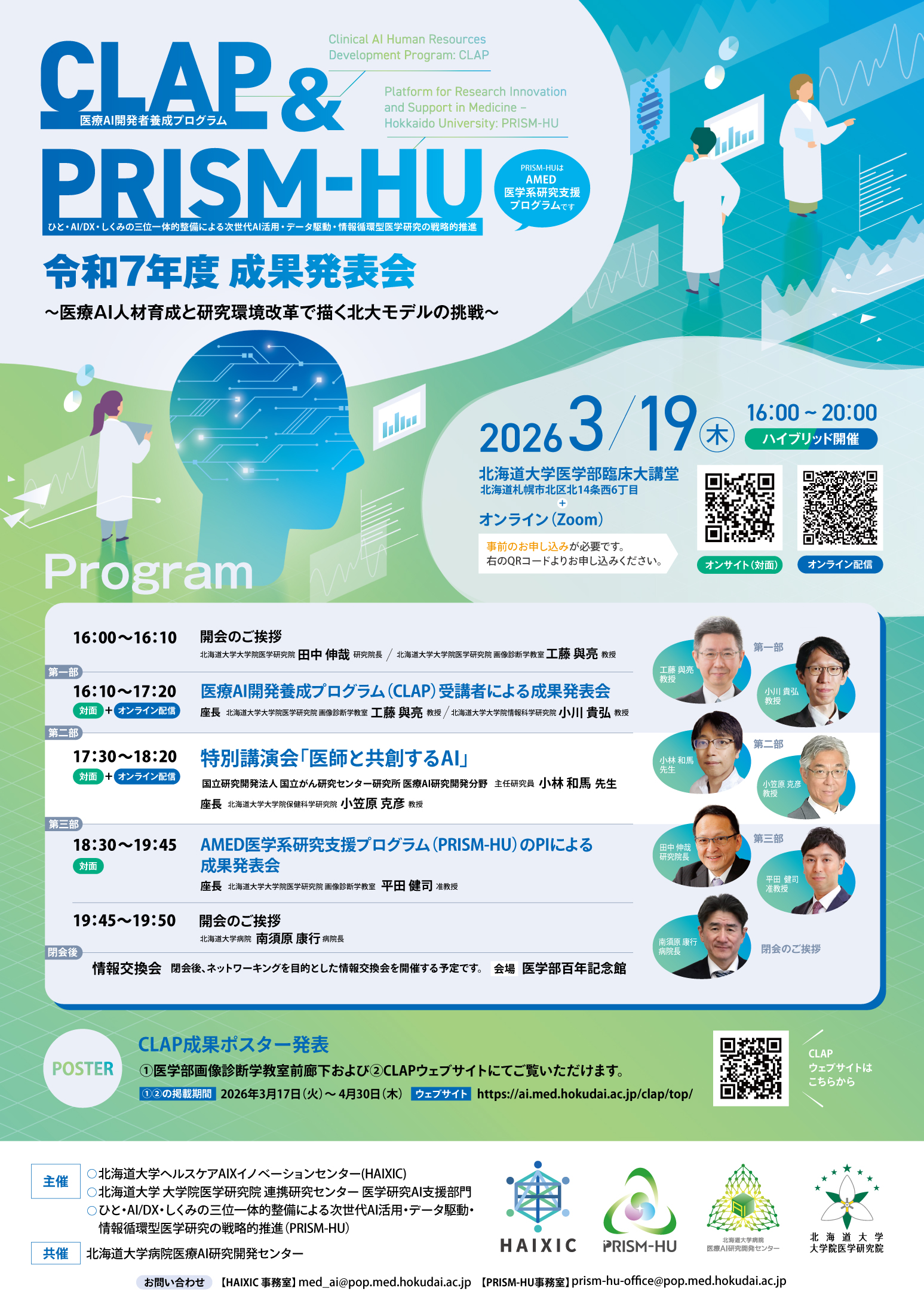 本発表会は、医療AI開発者養成プログラム(CLAP)およびAMED医学系研究支援プログラム(PRISM-HU)の成果を広く共有する場として開催されるものです。