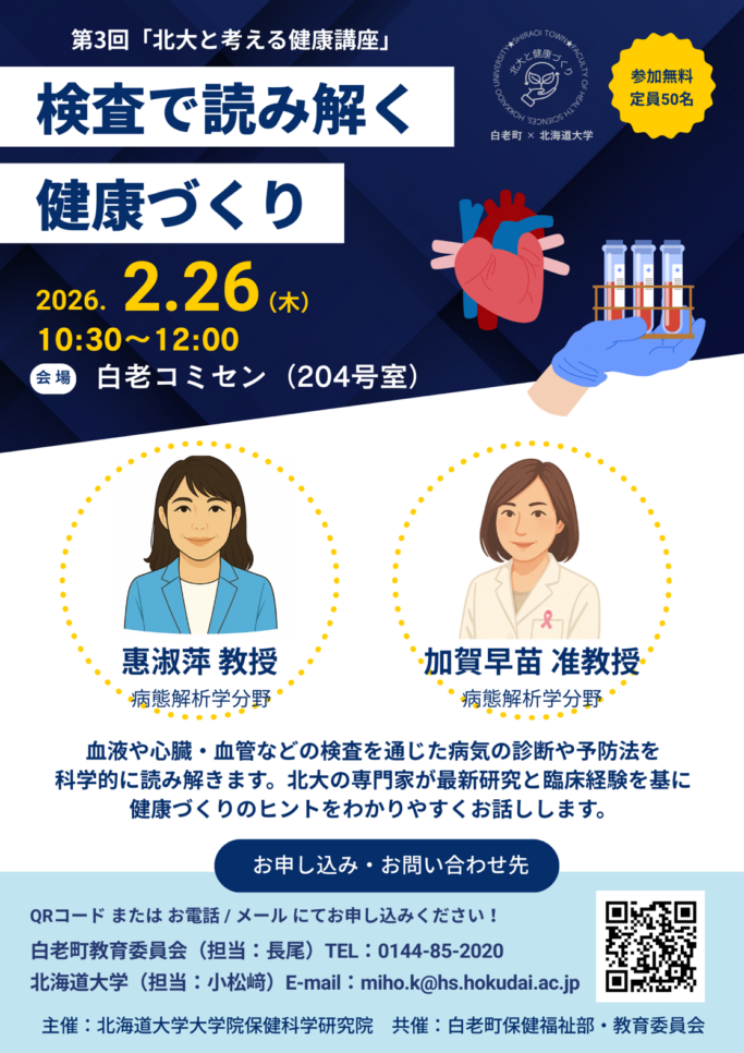 *本講座は、各部局の強み・特色に対する評価事業「ヘルスサイエンスを担う未来世代の人材育成を目指す健康エクステンションプロジェクト」の一環として、保健科学研究院と白老町が協働し12月から全4回の連続講座として企画・開催しています。