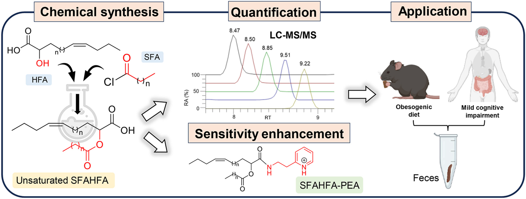 このライブラリーを用いて、従来の非誘導体化LC–MS/MS法と、2 (2 ピリジル)エチルアミンを用いた誘導体化による高感度LC–MS/MS法の2つの解析系を開発した。非誘導体化法ではマウスおよびヒトの糞便中に存在するSFAHFAを定量し、運動や高脂肪食など条件下での変動を明らかにした一方、誘導体化法では検出感度が約1000倍に向上し、フェムトレベルでの超高感度定量を実現した。本研究により、不飽和SFAHFAsの精密な定量・検出が可能となり、腸内細菌叢の乱れに関連する代謝疾患におけるSFAHFAsの機能解明への新たな道が開かれた。